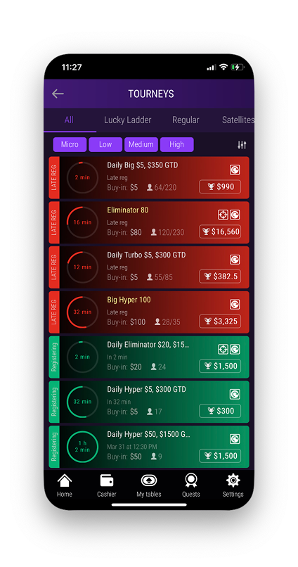 The mobile poker app is advanced and user-friendly, perfect for those who want to play online poker from their phones and tablets and have a chance to win real money. Players can join tournaments anytime, anywhere . All they have to do is launch the application on their phones (Android device or iOS) or tablet and click the Play button. With one touch, players can dive into the into the exciting world of online poker, play poker games, and win real money on their phone!